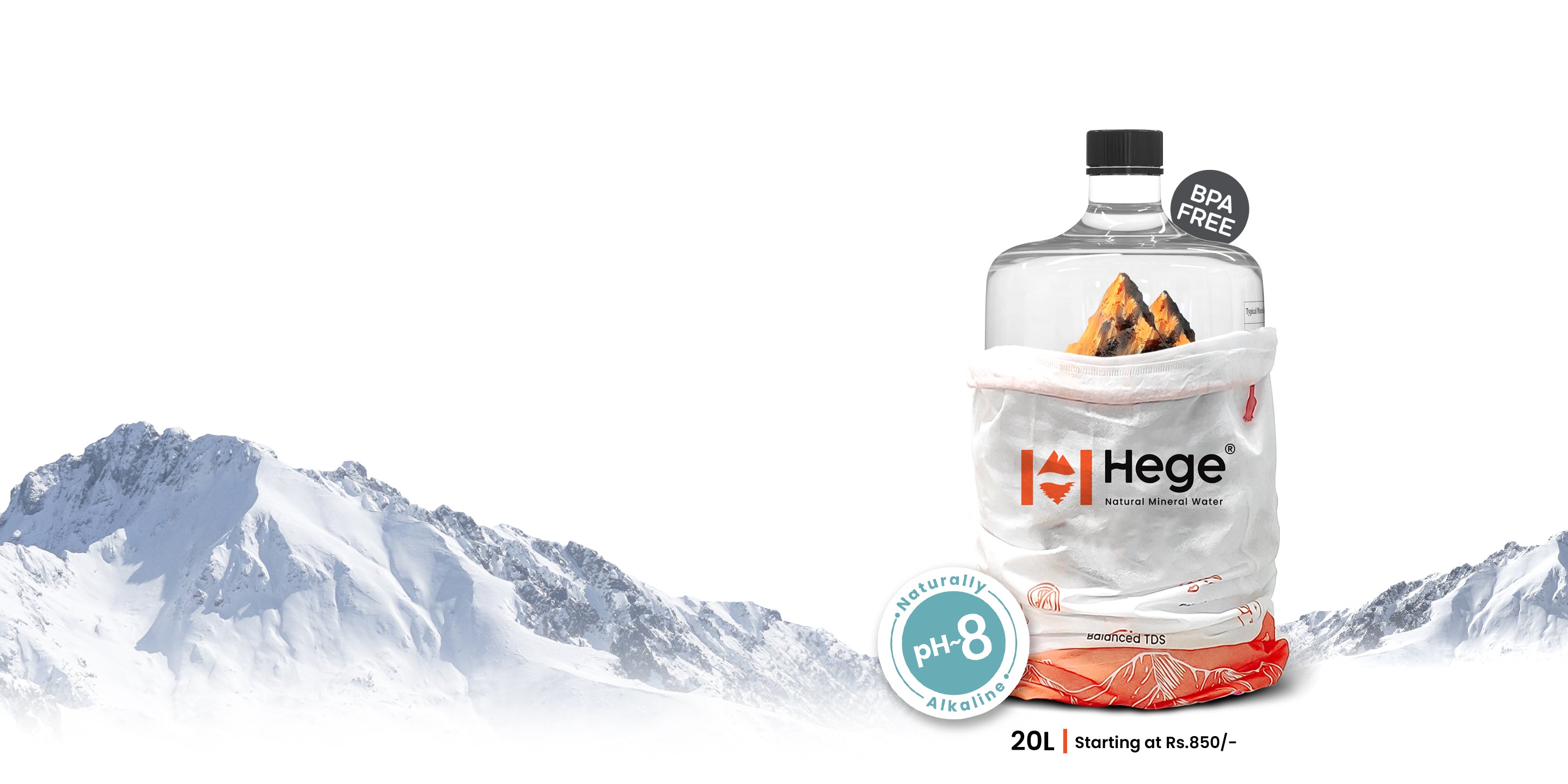 Hege: Nature infused minerals, refreshing hydration, sourced from the pristine Himalayas with essential minerals present in Himalayan bedrocks.