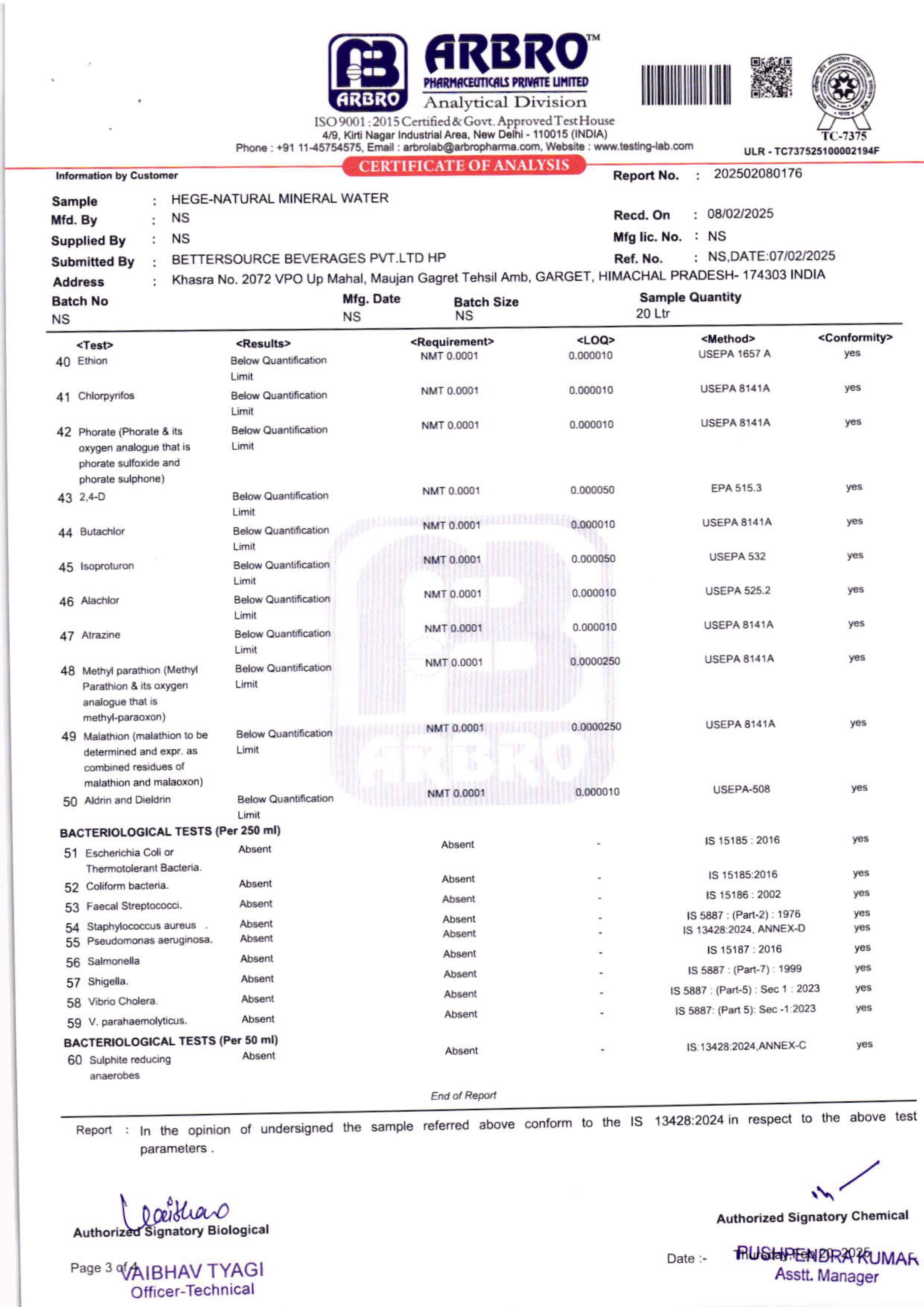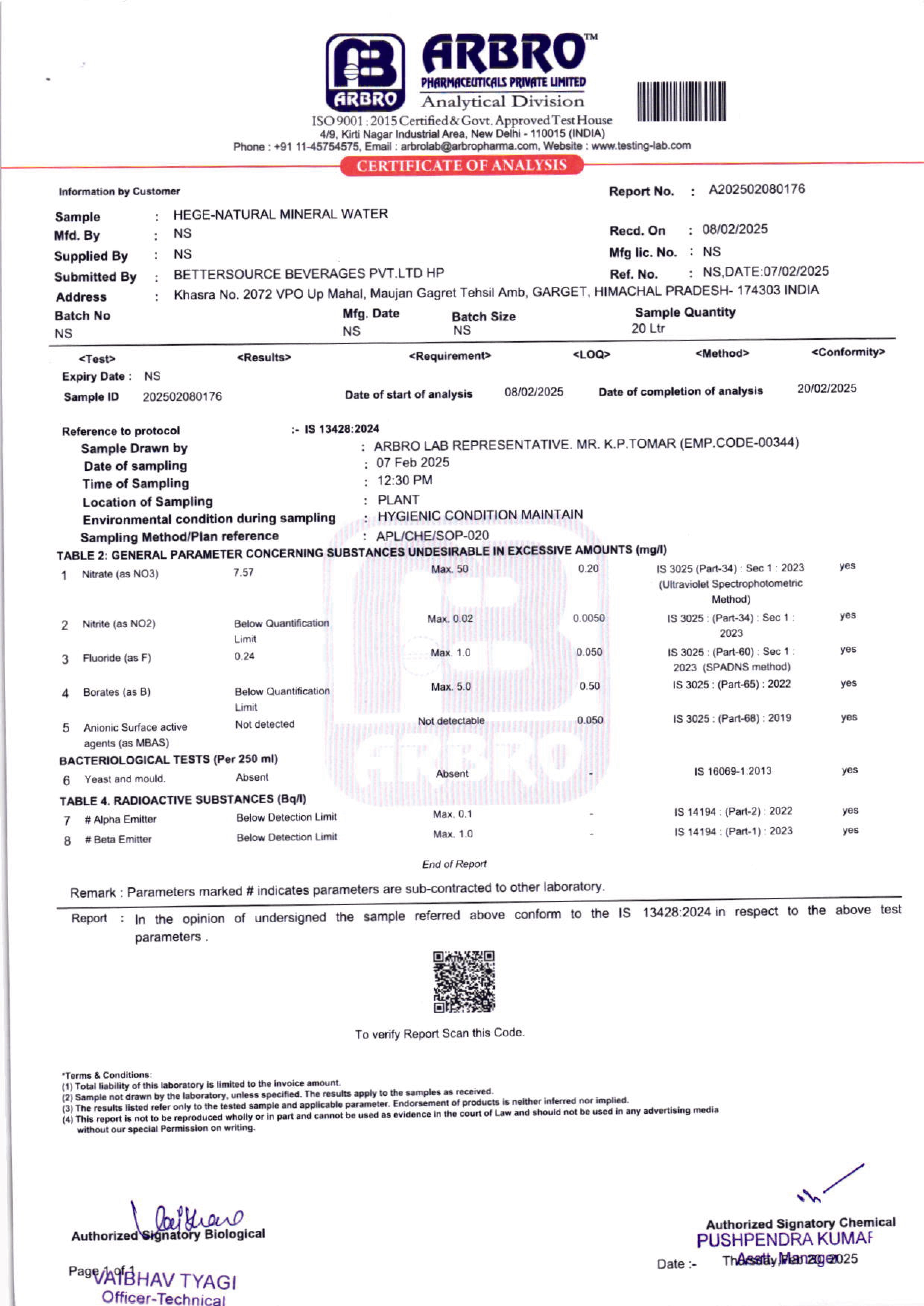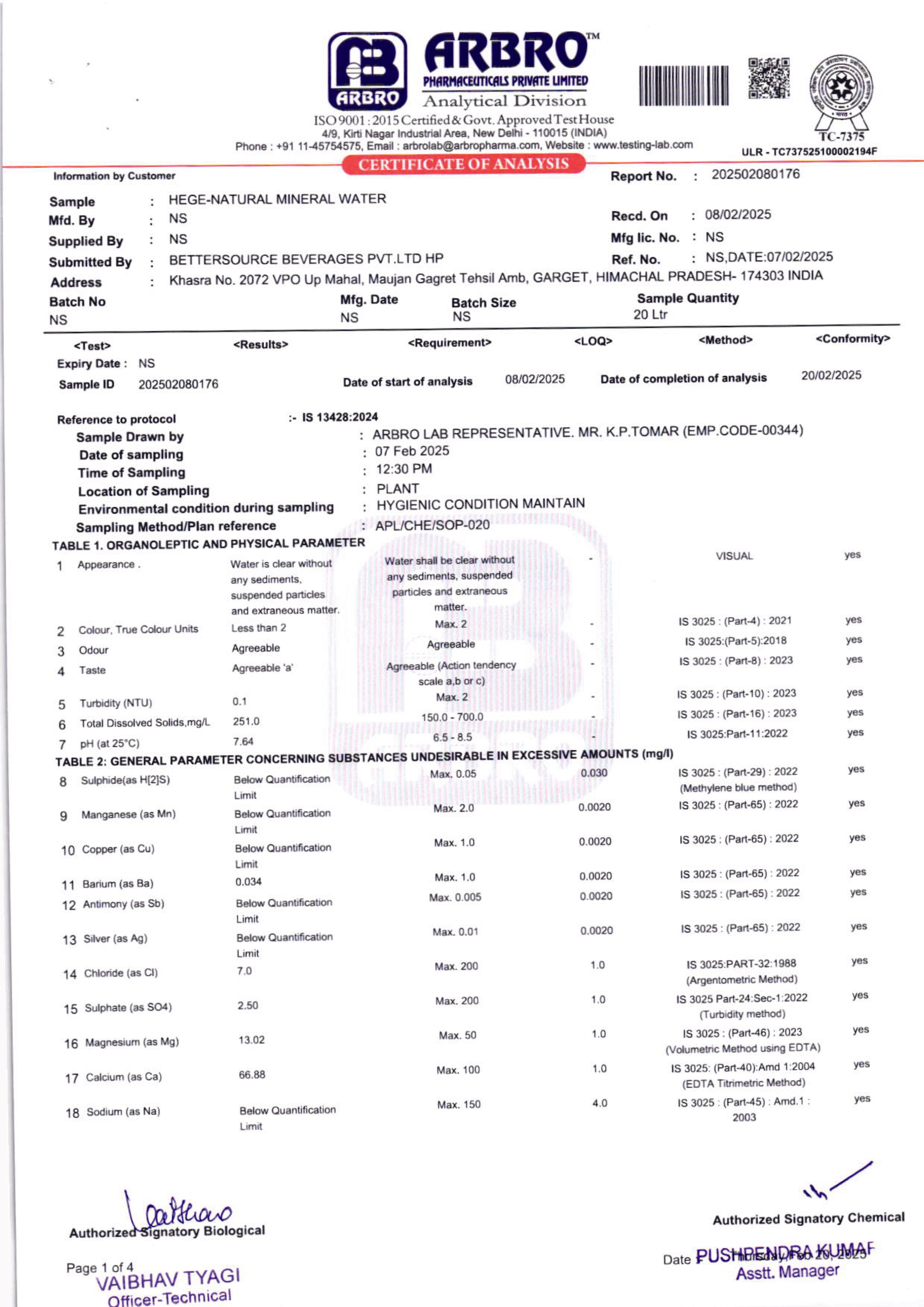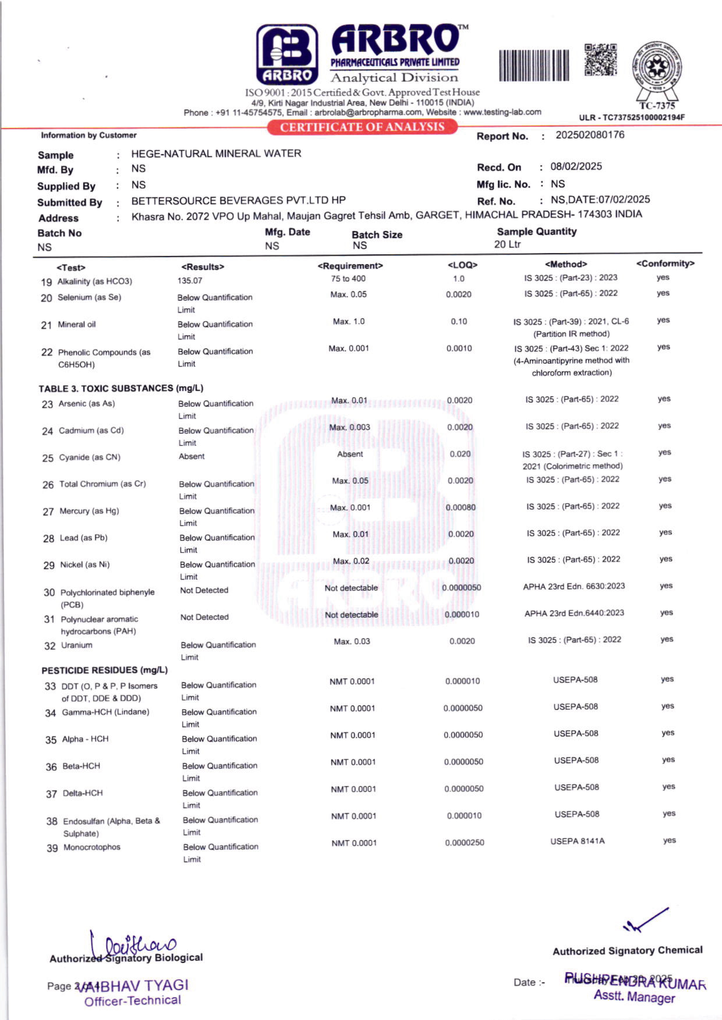 • Lab Reports Of Natural Mineral Water - Hege