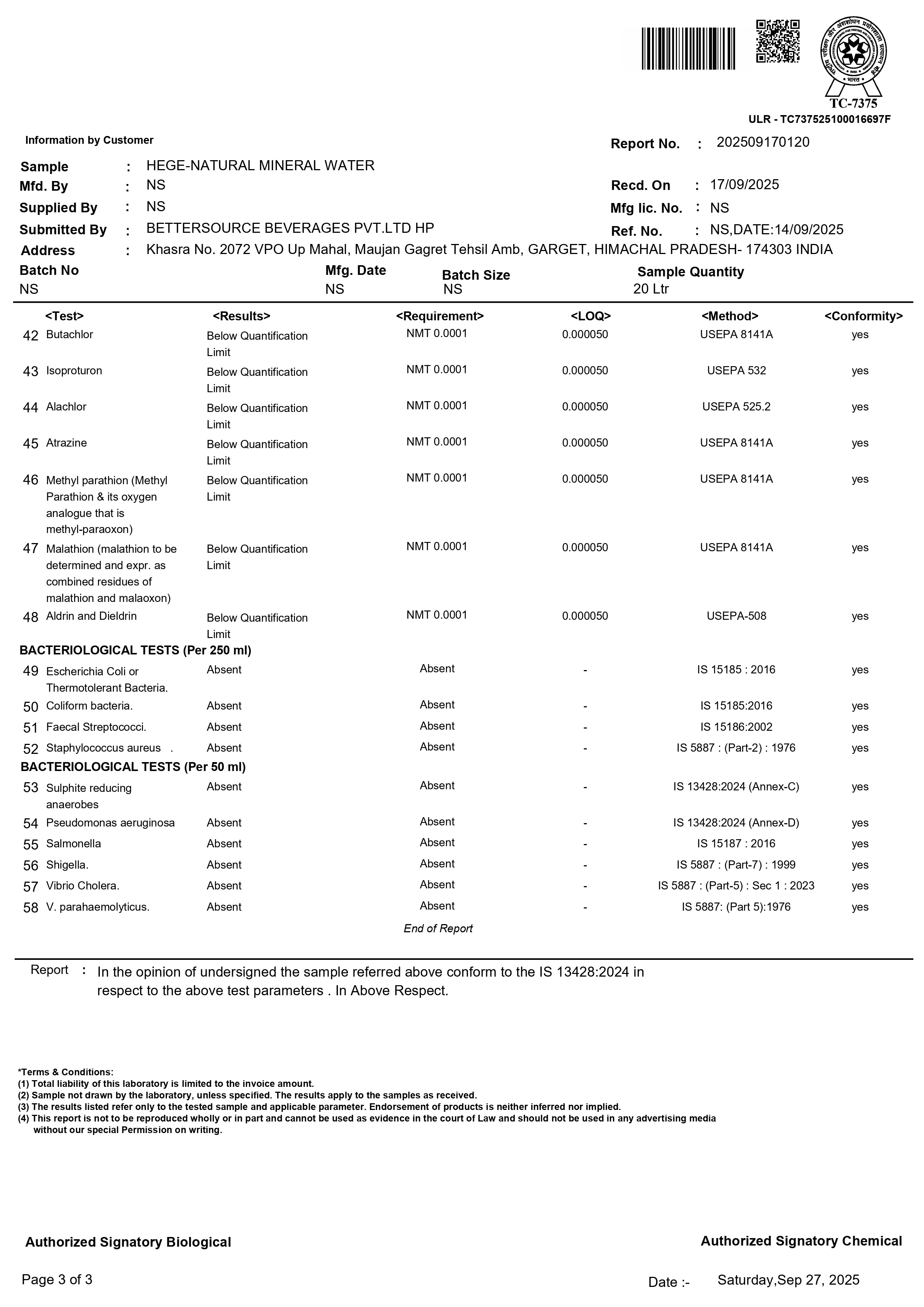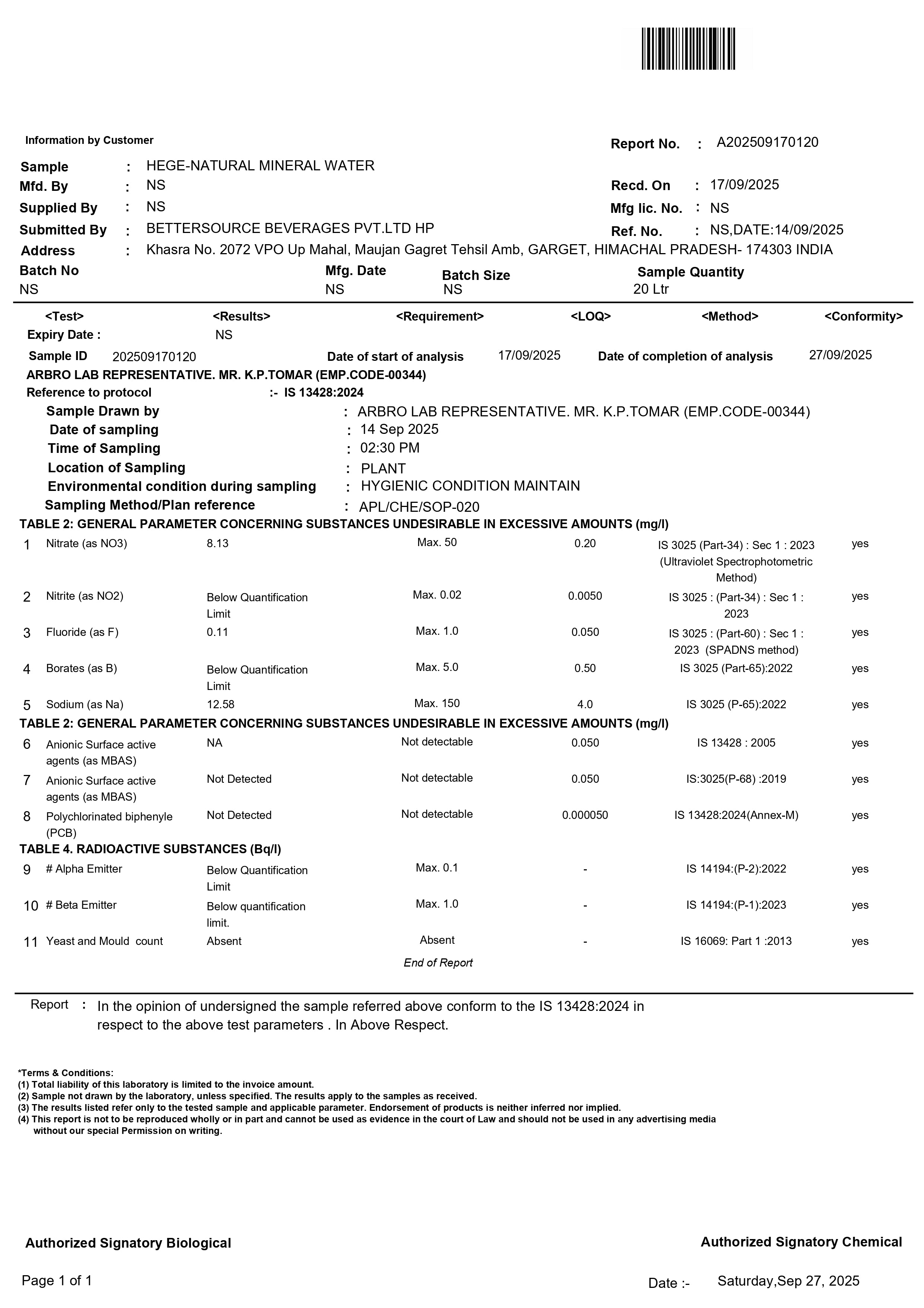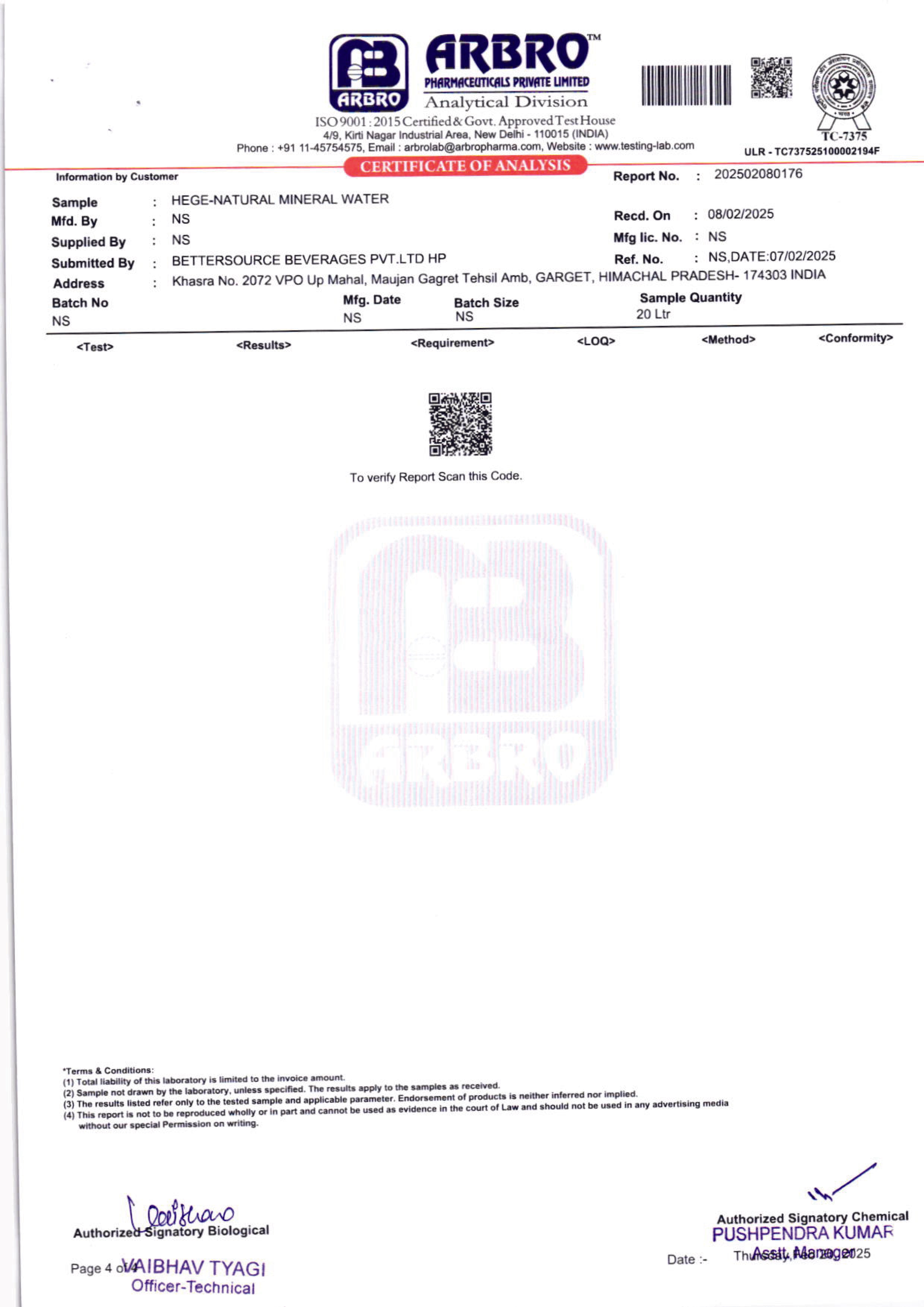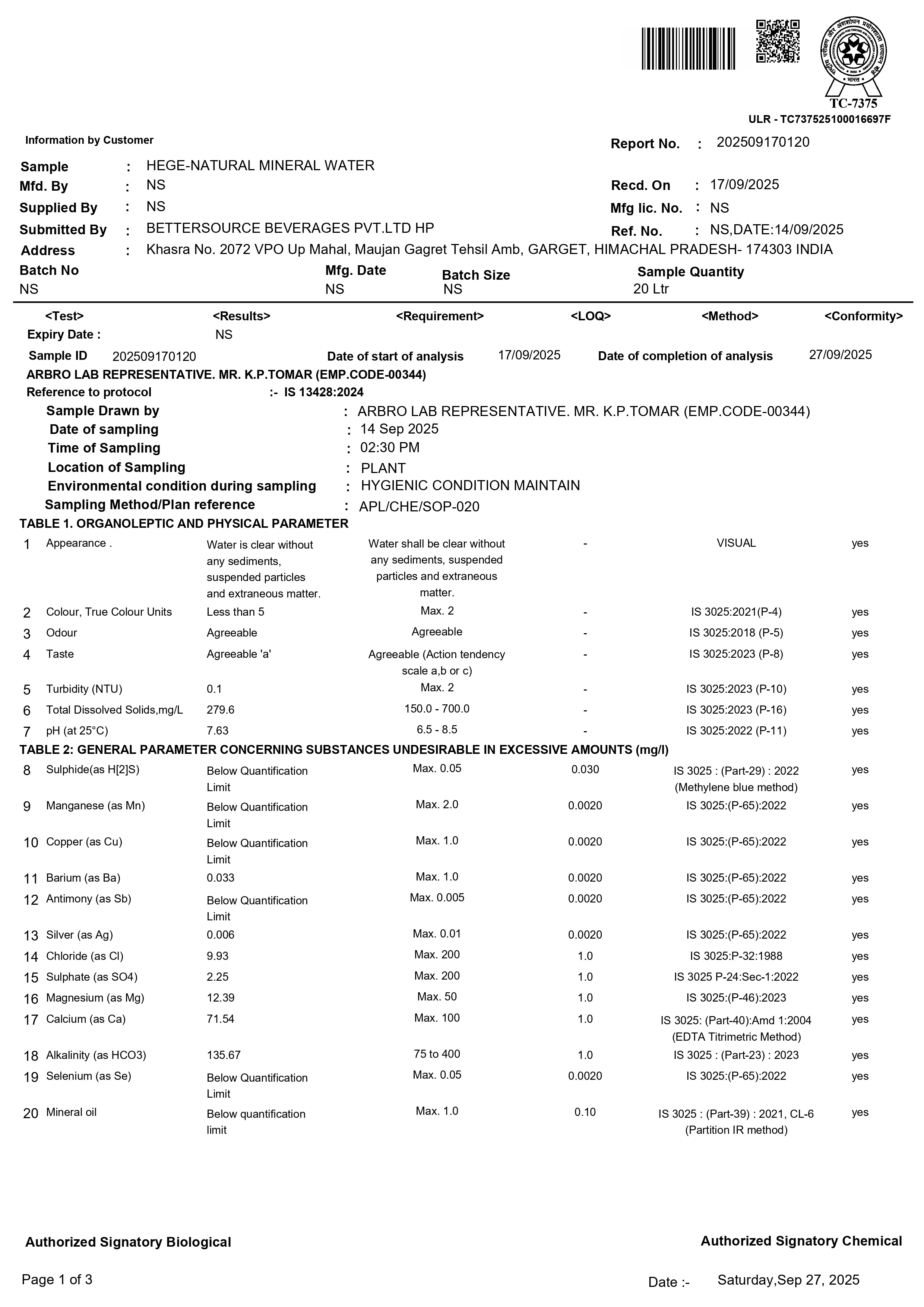 • Lab Reports Of Natural Mineral Water - Hege